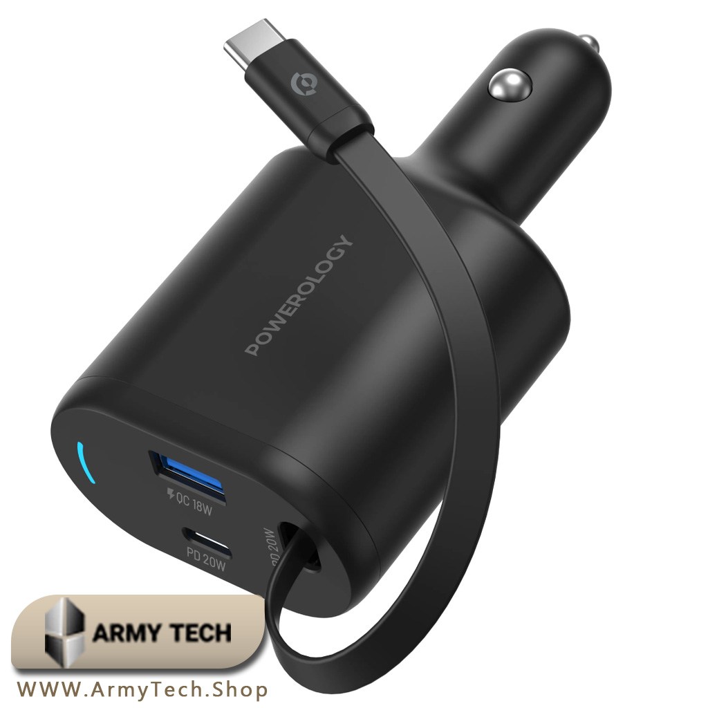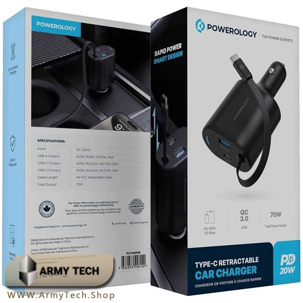 شارژر فندکی پاورولوجی PCCSR018 Type-C Retractable 70W (QC30W + PD20W + 20W)