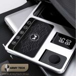 یکی از ویژگیهای جالب این پایه شارژ، قابلیت «ONE TOUCH AUTOMATIC LIFT» است که روی جعبه محصول نیز اشاره شده است. این مکانیزم کمک میکند قسمت نگهدارنده گوشی بهصورت خودکار بالا یا پایین بیاید تا بتوانید گوشی را آسانتر روی آن قرار دهید یا بردارید. همچنین ساعت دیجیتال داخلی امکان تنظیم آلارم بیدارباش را فراهم میکند و شما میتوانید زمان را بدون نگاه کردن به موبایل خود کنترل کنید.
